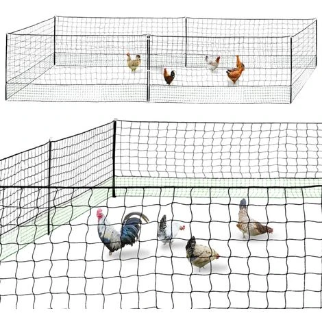 Descriptif du kit clôture filet à poules 12 MÉlever ses poules en plein air c’est désormais possible ! Grâce au filet à poules de 12 M de long, vous pourrez garder vos poules dans un coin de votre jardin sans vous soucier de leur sécurité. Facile à installer, il est composé de matériaux robustes comme ses tiges double pointe en fibres de verre qui vous permettront de disposer d’un kit résistant aux intempéries. Grâce à la porte ultra pratique, vous pourrez accéder très facilement à l’intérieur du parc sans que vos poules ne s’échappent. Notre astuce sécurité : le filet en plastique se distingue en deux coloris : noir pour la partie du haut avec des grosses mailles de 10 cm et vert pour la partie du bas avec des petites mailles de 4.5 cm.Atout indispensable à l’épanouissement de vos poules, le filet peut également s’utiliser comme extension de leur enclos ou de leur poulailler. Il peut également servir de barrière afin d’empêcher vos volailles de se faufiler à certains endroits de votre terrain. Grâce à la porte intégrée, vous pourrez entrer et sortir très simplement du parc sans devoir enjamber toute la hauteur du filet. Avec ses couleurs discrètes, le filet à poules 12 M se fondra parfaitement dans votre jardin et s’adaptera à vos besoins en lui donnant la forme que vous souhaitez. Qu’attendez-vous pour craquer pour son petit prix ? Dimensions du kit clôture filet à poules 12 M – Dimensions : Longueur 1200 cm x Hauteur 115 cm- Hauteur d’un piquet : 110 cm- Filet en plastique noir et vert- Casquette et fil blancsChaque kit de 12 M est composé de : – 1 filet- 5 tiges (double pointe) de fibres de verre avec 10 vis pour tige de fibres de verre- 5 casquettes- 5 crochets – 4 fils- 1 poteau de porte avec 1 plaque de porte et 1 pièce de connexion de porte- 1 clou en plastique pour le poteau de porte- 16 chevillesLe kit filet à poules est également disponible en version 24 M sur notre boutique en ligne !