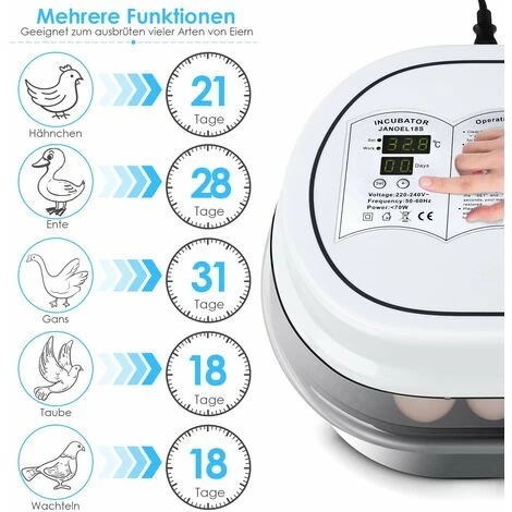 - 【Largement utilisé】Remarque: Une fois que les poussins ont réussi à éclore, veuillez retirer les poussins de l’incubateur immédiatement pour éviter sa mort en raison d’une température élevée ou d’un manque d’oxygène. Notre incubateur peut faire éclore jusqu’à 18 œufs, ainsi que dinde, oie, oiseau, caille et d’autres espèces. Non seulement en réponse aux éleveurs de volailles et aux agriculteurs, mais aussi aux amateurs qui éclosent des œufs.