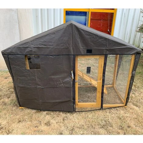 Housse de protection sur mesure pour votre poulailler bois Orava. Matières : tissu, plastique et métal Ouvertures zippées et scratchées Œillets d’aération en métal Adaptée sur mesure Protège le poulailler, garde les poules au sec.