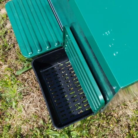 Batterie de pondoirs pour poule en métal composée de quatre nichoirs avec entrée à l’intérieur et bacs de récupération des œufs à l’extérieur. Dimensions : L106 x l52 x H48 cm Structure en métal galvanisé Fonds en plastique avec bacs de récupération Toit peint en vert Conçu pour être accroché à une paroi ou monté sur des pieds Marque : Gaun